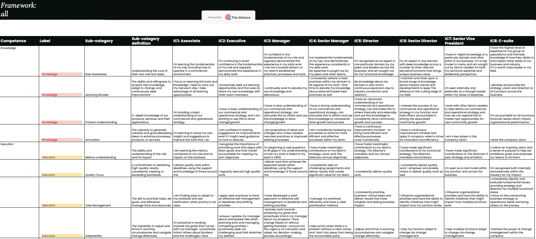 - Review the competencies. You’ll see categories such as knowledge, execution, collaboration, communication, ownership, and leadership (each with clear level-by-level definitions).