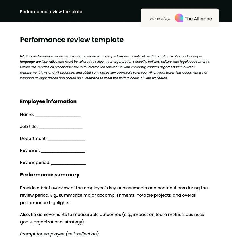 - Share it: Provide the template to managers and employees before review meetings so everyone can prepare.