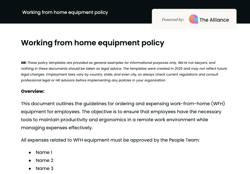 Our working from home equipment policy template helps you set consistent, transparent guidelines for how remote and hybrid team members access and manage their work-from-home equipment, all while keeping costs under control.